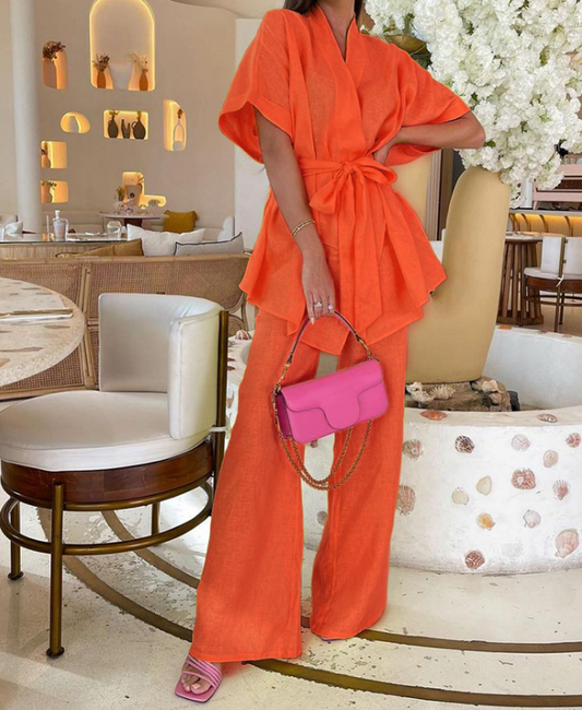 Fashion Suit Cotton Linen Short-sleeved Pants Two-piece Belt Design Sense Of Casual Women's Clothing