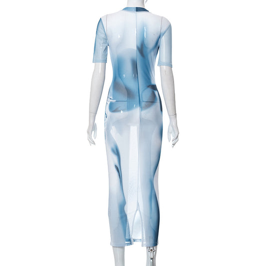 Mesh Floral Print Round-neck Flared Sleeves Side Open Sheath Dress