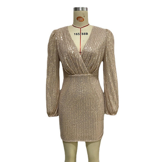 Long-sleeved Slim Collar Sequined Hip Tight-fitting Nightclub Dress Women
