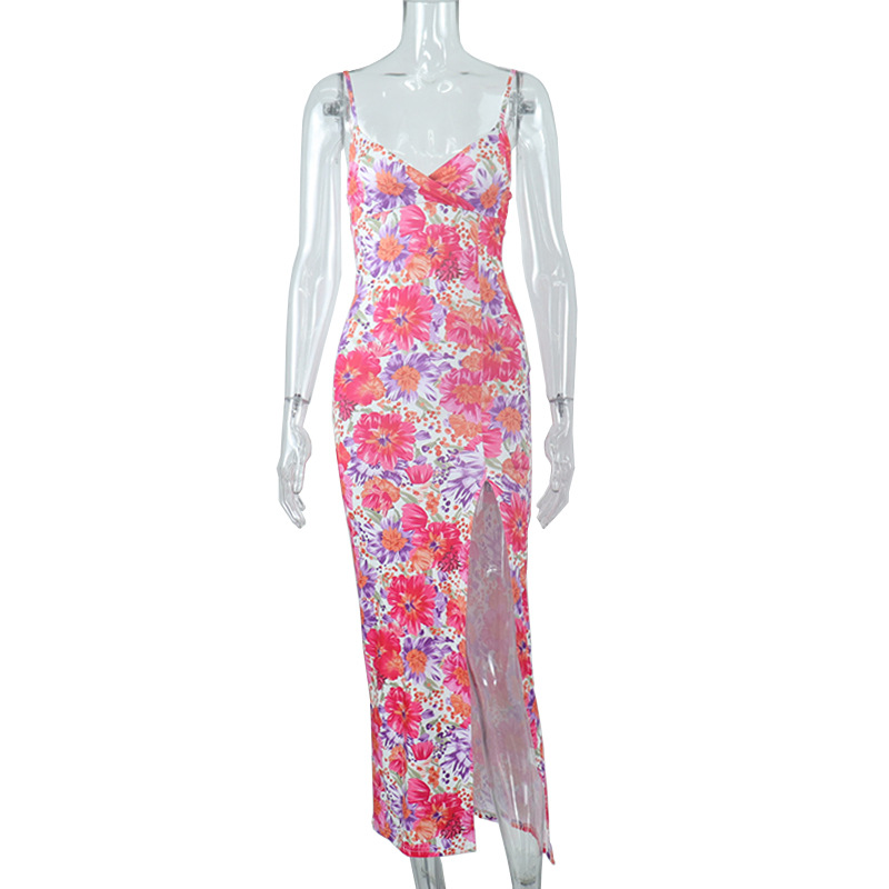 Digitally Printed V-neck Suspender Medium Long Slit Suspender Dress