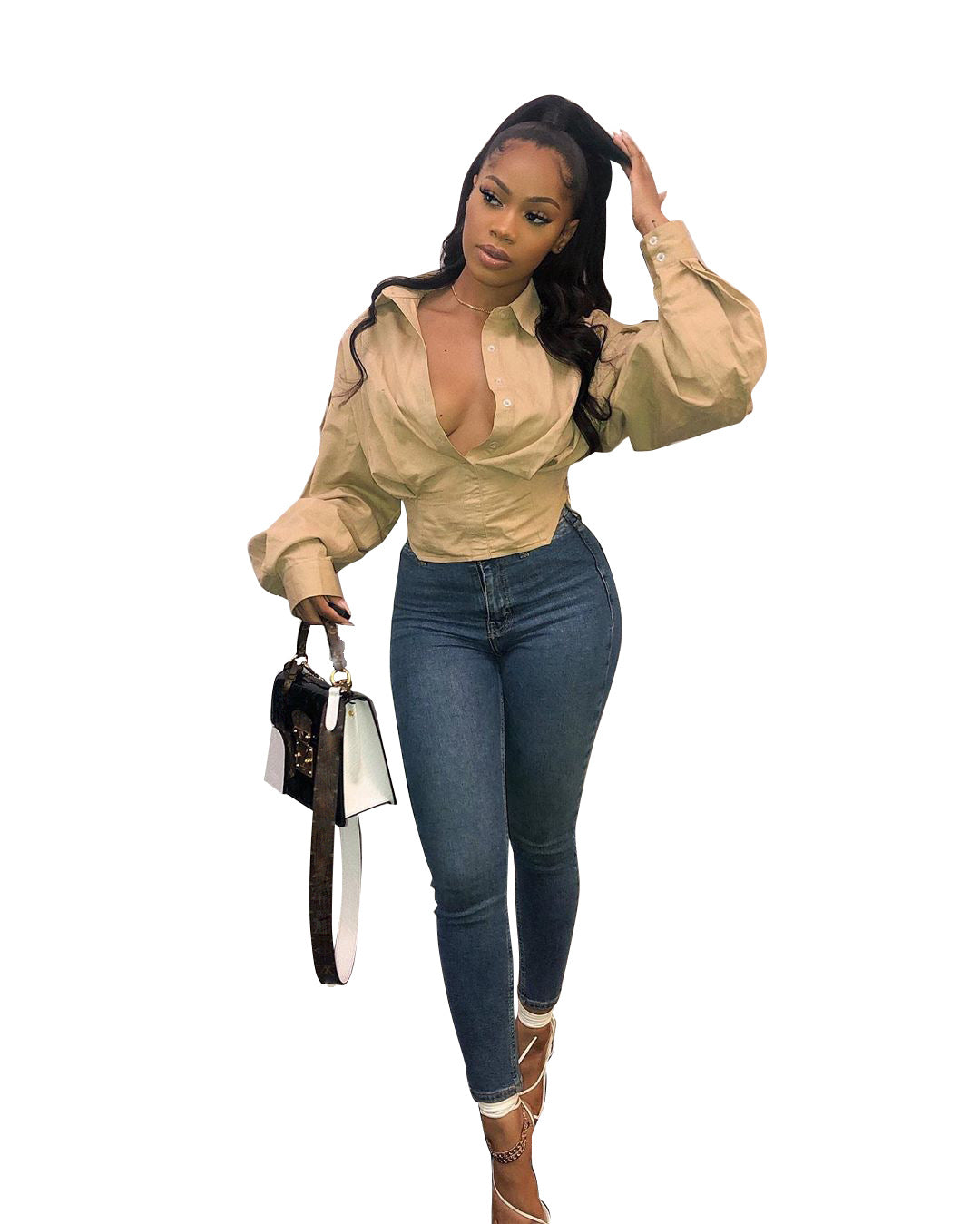 Fashion slim temperament solid color lantern sleeve shirt