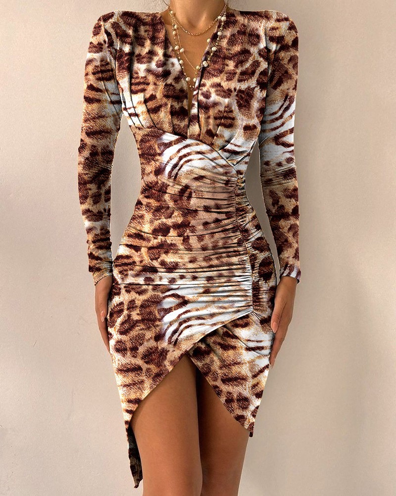Long Sleeve V Neck Printed Skinny Slit Dress Women's