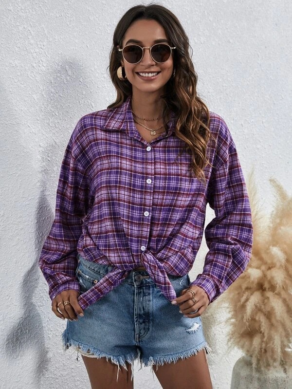 Loose And Slim Lapel Long Sleeved Brushed Plaid Shirt