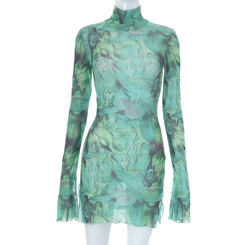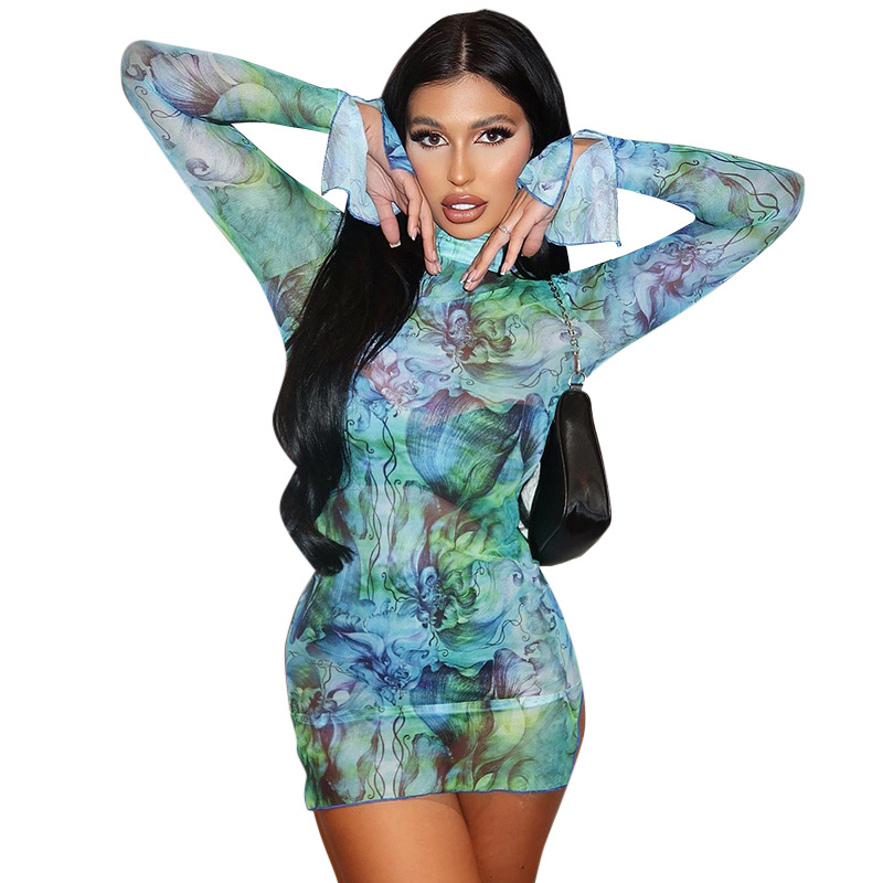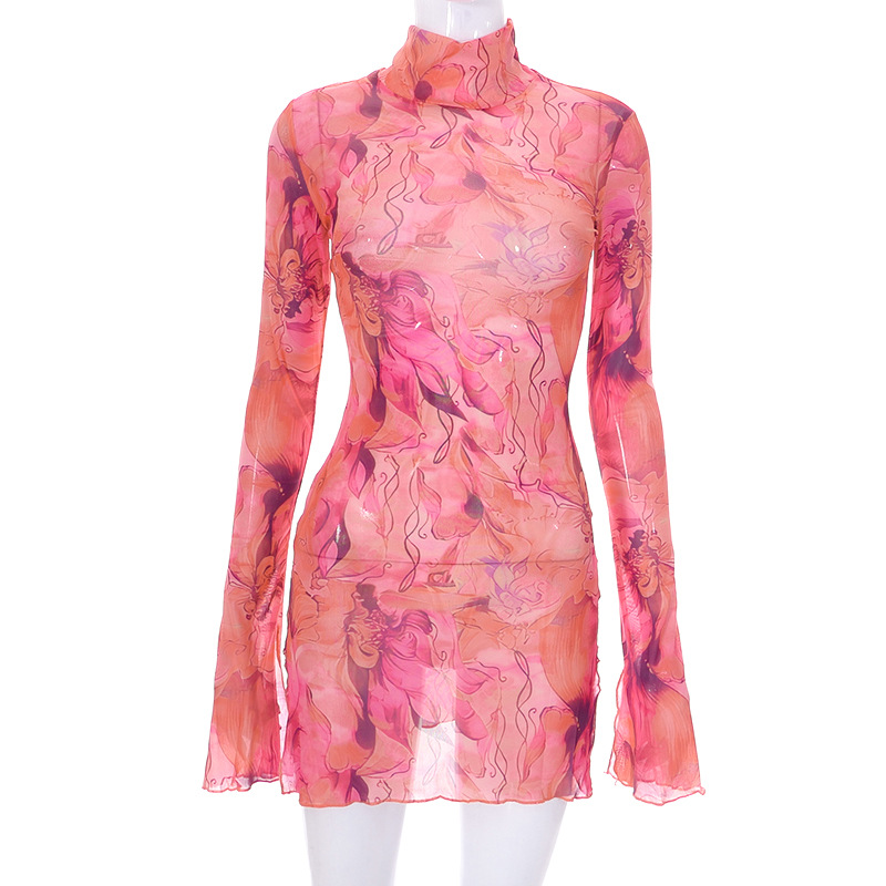 Mesh Floral Print Round-neck Flared Sleeves Side Open Sheath Dress