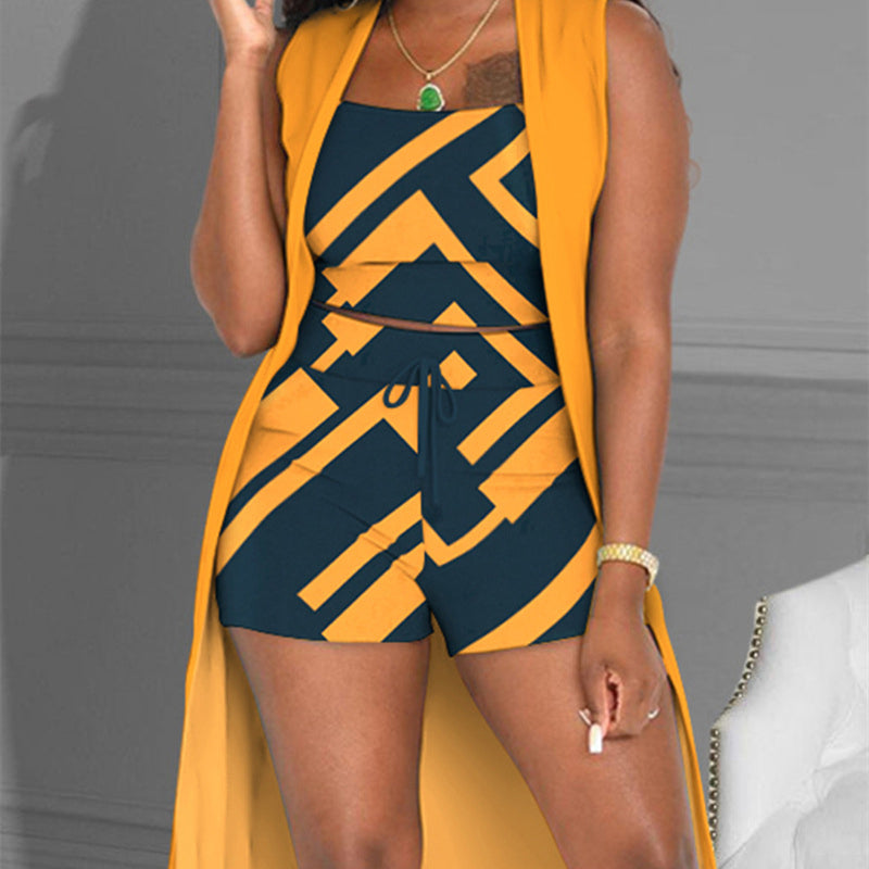 Monogram Print Contrasting Color Coat Shorts Three-piece Set