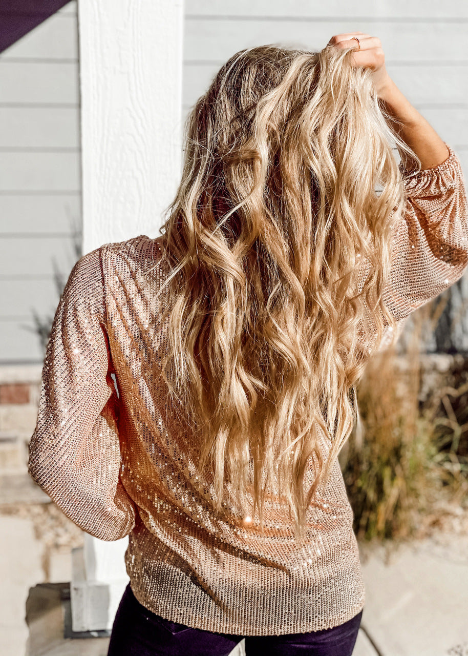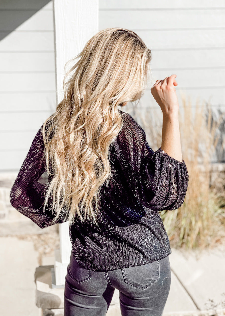 New Women's Sexy See-through Sequined V-neck Lantern Sleeve T-shirt Top