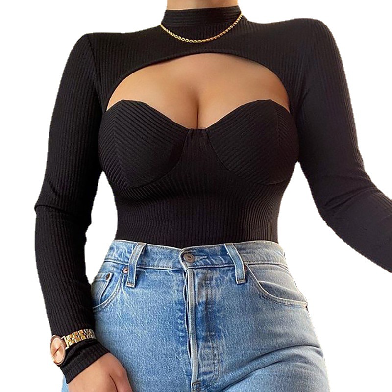 Round Neck Long Sleeve Fashion Personality Low Cut T Shirt
