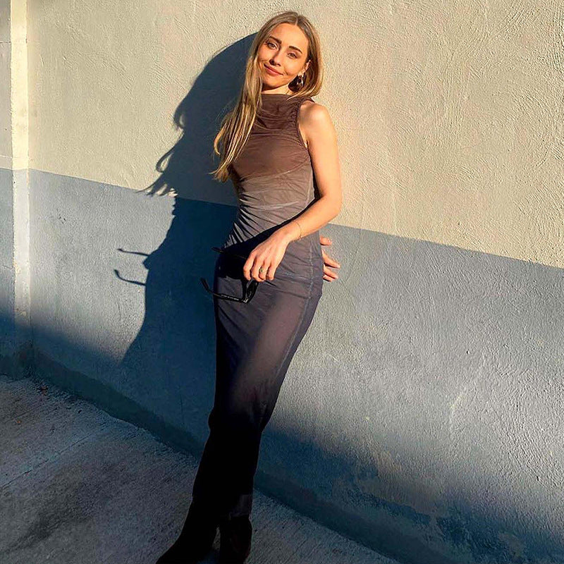Round Neck Sleeveless Tie-dyed Mesh Long Dress