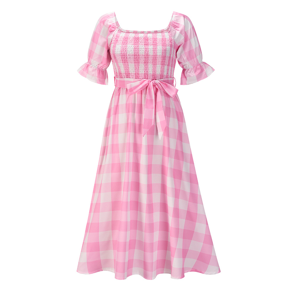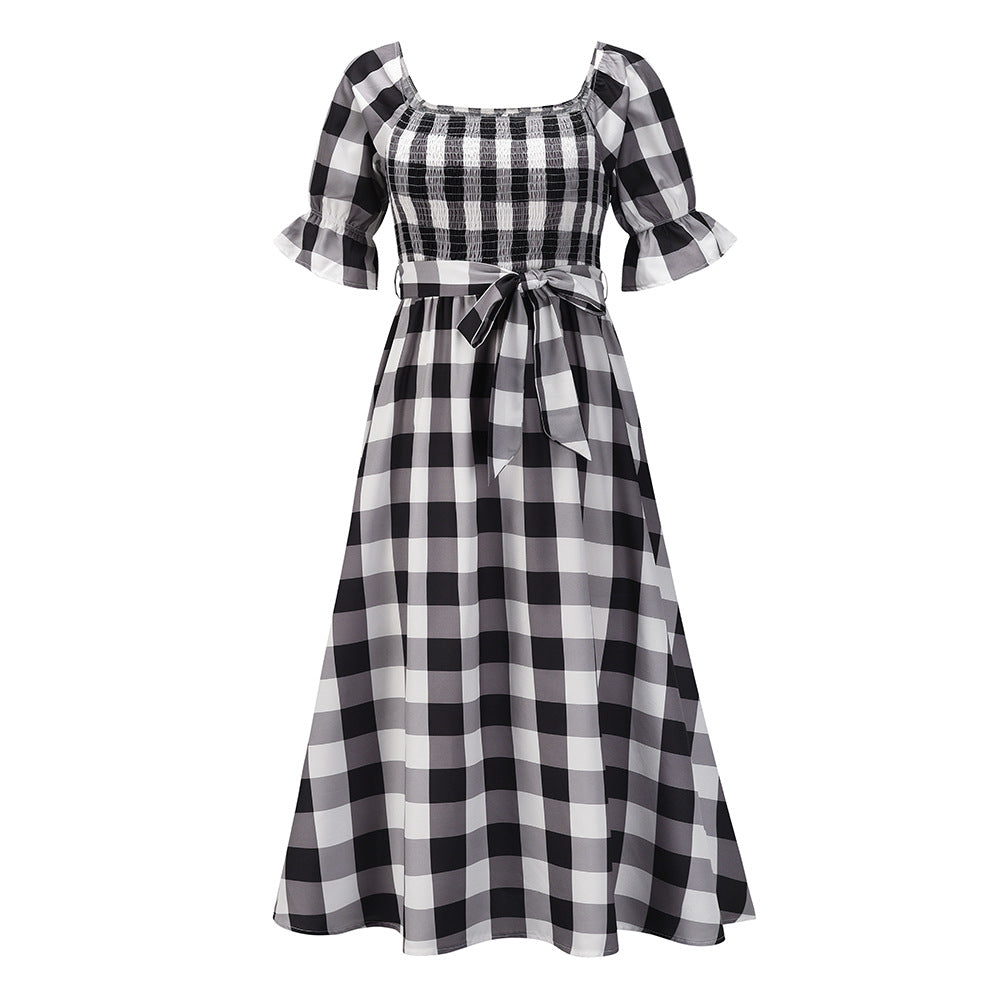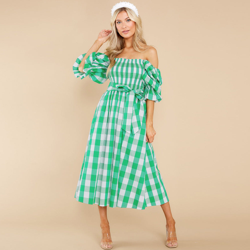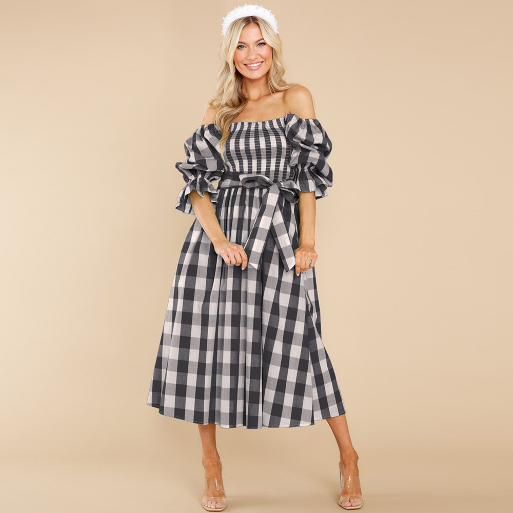 Slim One-neck Off-the-shoulder Plaid Print Beach Dress