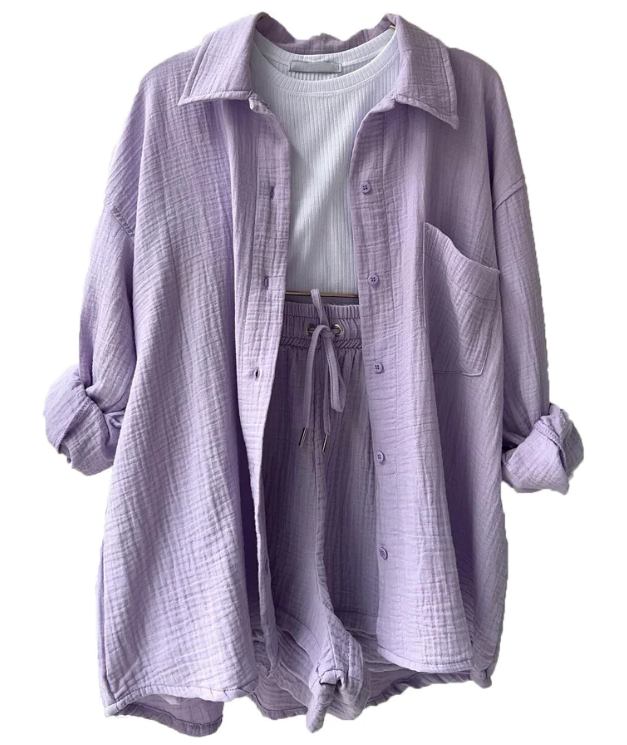 Women's Wrinkled Fabric Lapel Long Sleeved Shirt Shorts Fashion Casual Set